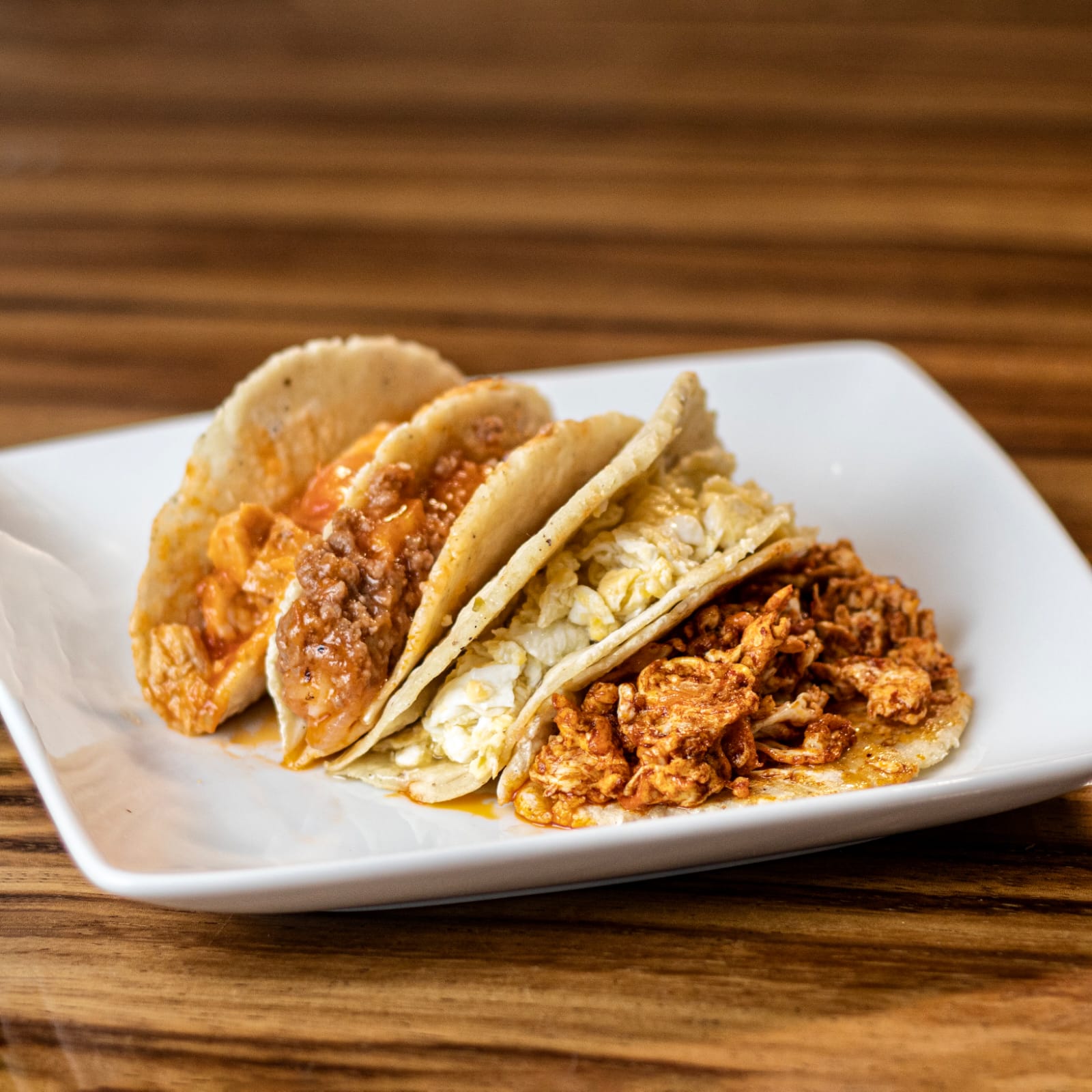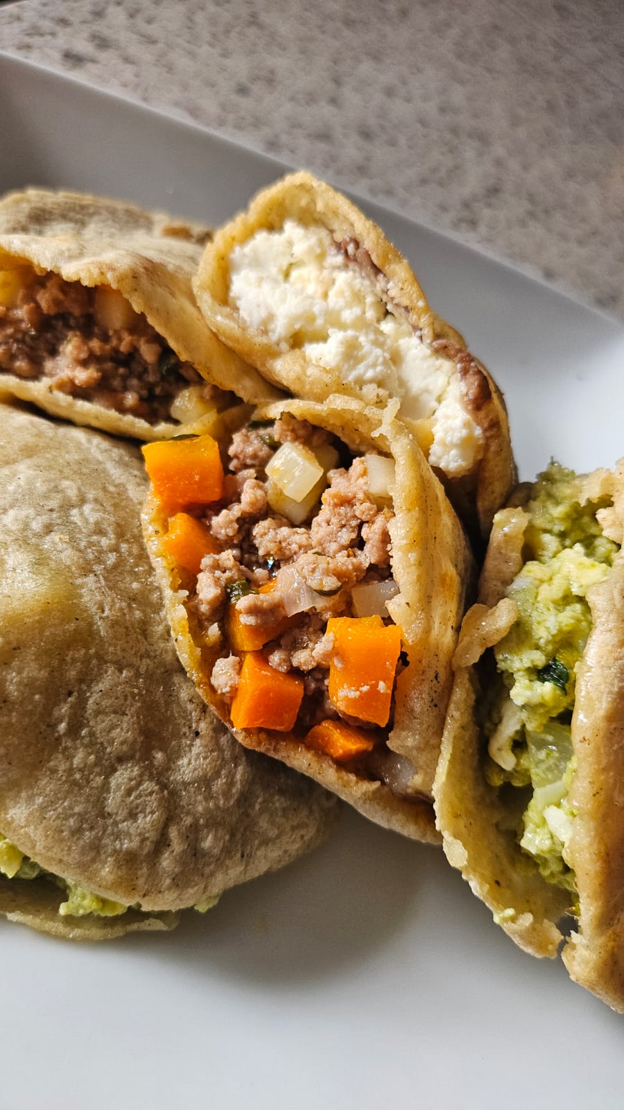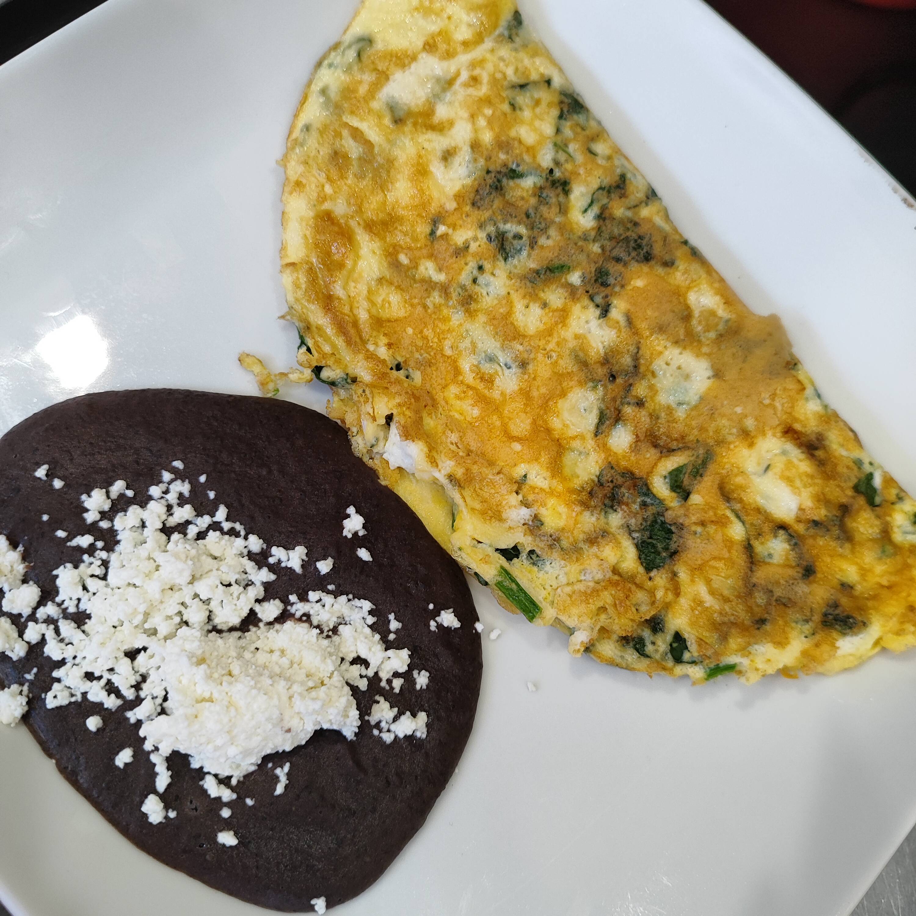 Tortilla recién hecha (huevo, huevo rojo, huevo verde, chicharrón, picadillo y frijolitos con queso.