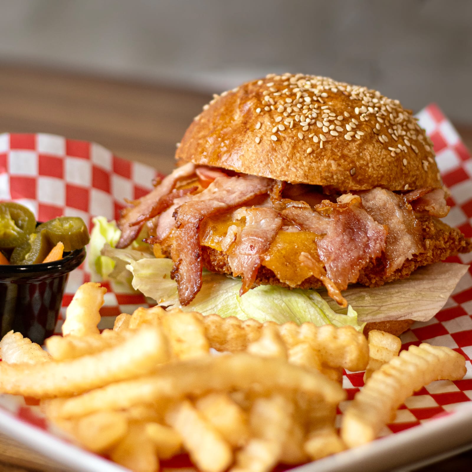 Aderezo de la casa, tocino, queso cheddar, cebolla morada, lechuga y tomate. Acompañada de papas fritas.