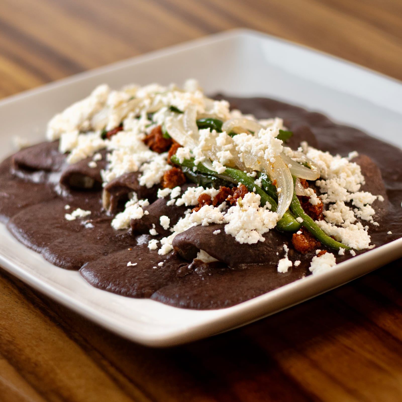 Rellenas de pollo, acompañadas de chorizo y chiles salteados.