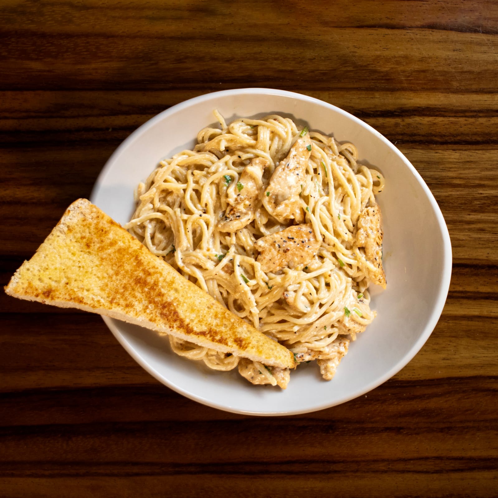 Fetuccini en crema de parmesano, con boneless bañados en nuestra deliciosa salsa buffalo.