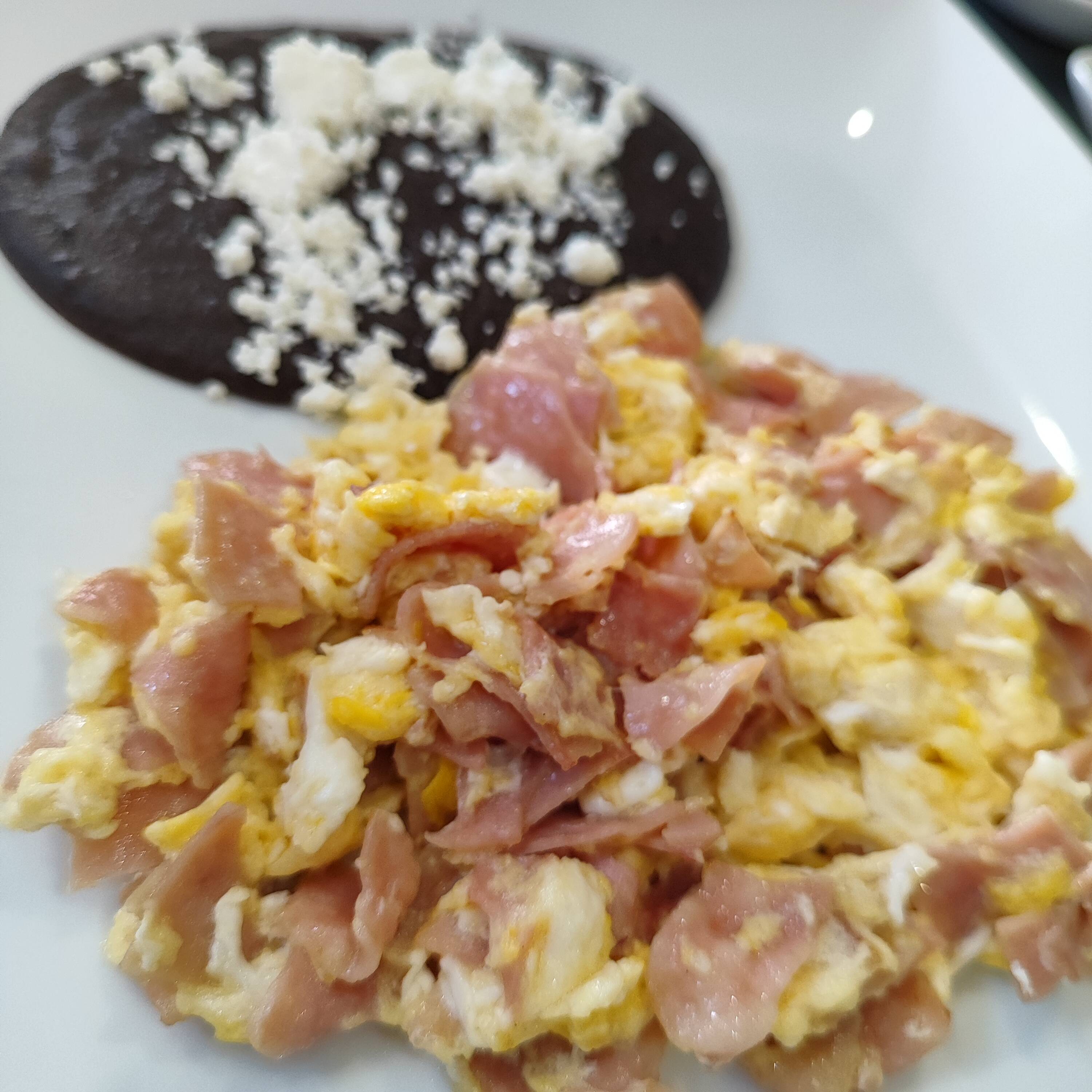 Huevo, Huevo rojo, huevo verde, chicharrón, picadillo, frijoles con queso.