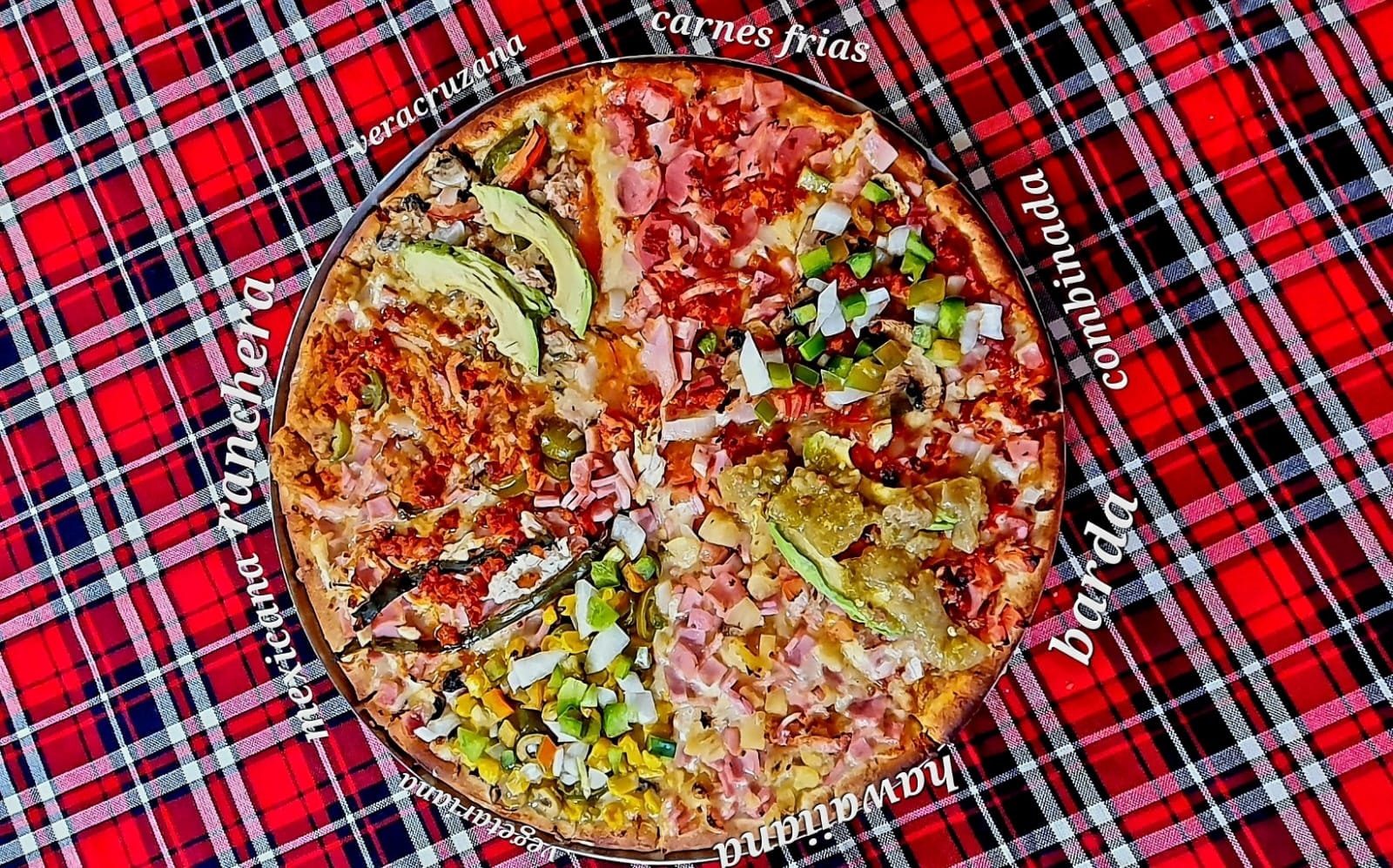 Pizza con arrachera, pimiento, chorizo, cebolla y champiñón.