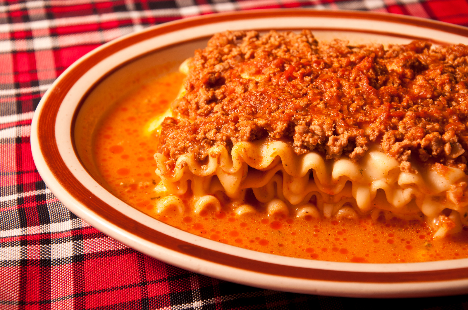 Pasta de lasaña bañada en salsa de carne con queso y espinaca.
