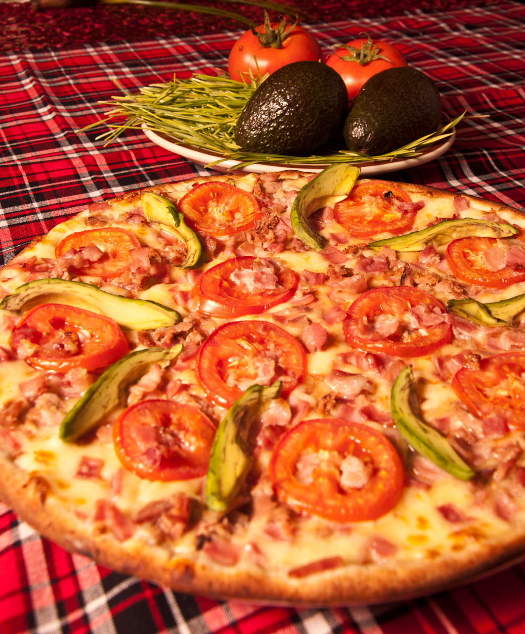 Pizza con jamón, atún, tocino, aguacate y tomate.