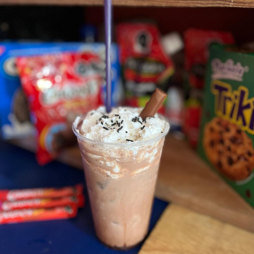 Frappe de CarlosV cubierto de hersheys crema chantilly y chispas de chocolate