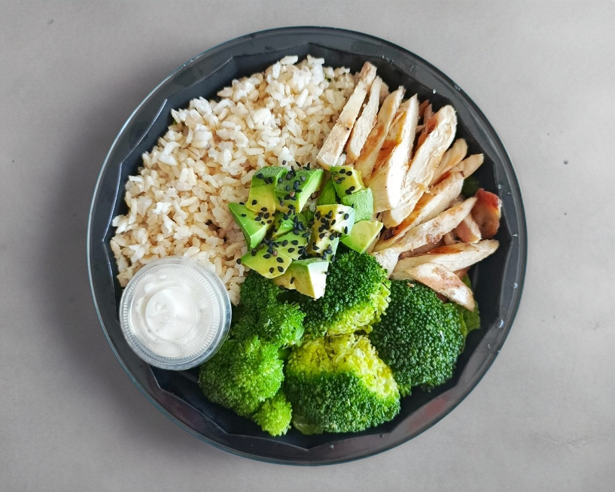 Pechuga de pollo entera, base de mix de lechugas, brócoli crocante, arroz integral, aguacate y ajonjolí negro.