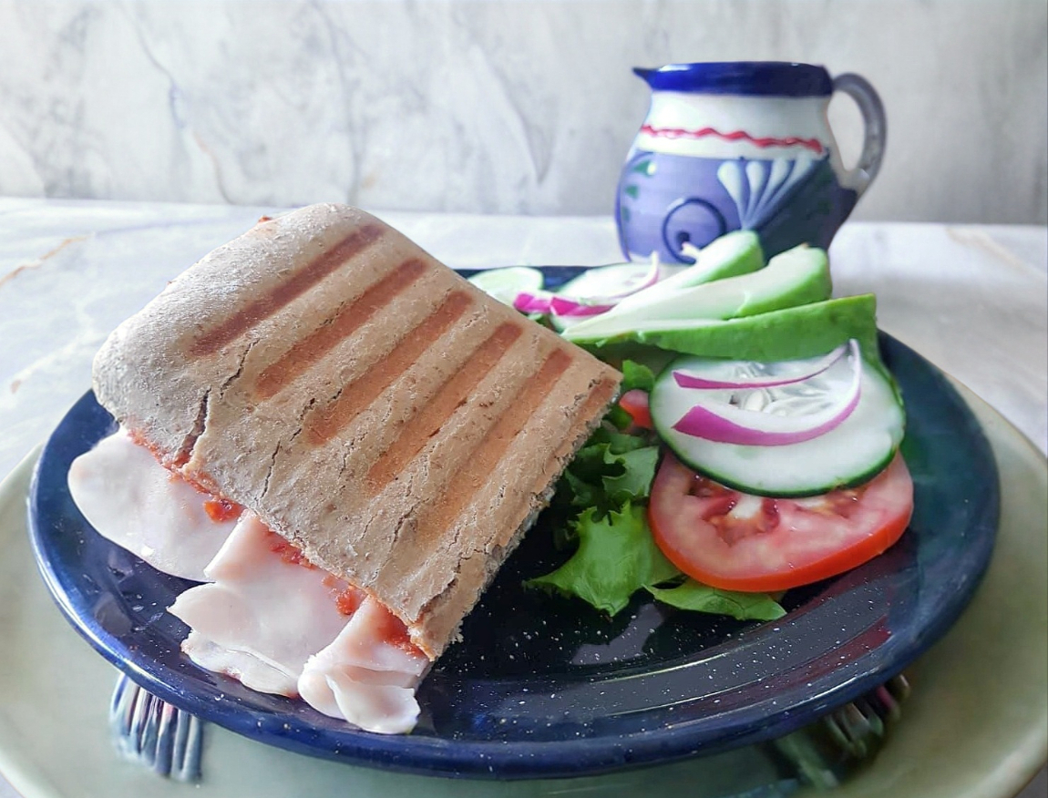 Pan de 12 granos , jamón de pechuga de pavo natural, queso panela, mayonesa, lechuga, tomate, pepino, cebolla morada y aguacate.