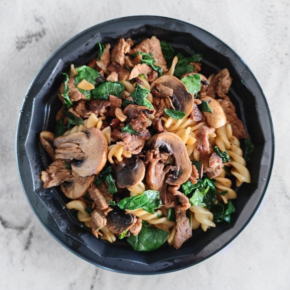 Salteado de res con pasta y espinacas