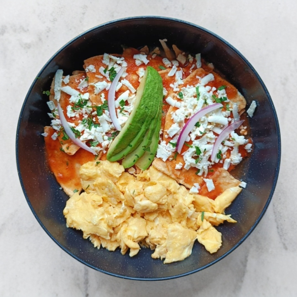 Totopos horneados de maíz con salsa (servida aparte para que no lleguen batidos) acompañados de huevo revuelto, queso panela y aguacate.