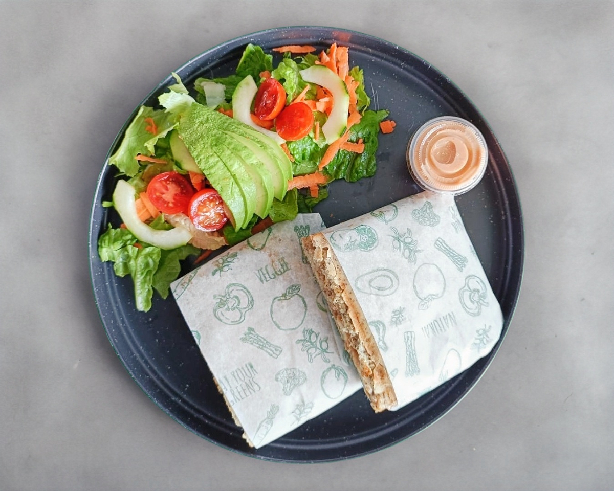 Jamón de pechuga de pavo natural y queso Oaxaca, acompañado de ensalada con aguacate, aderezo y chiles.
