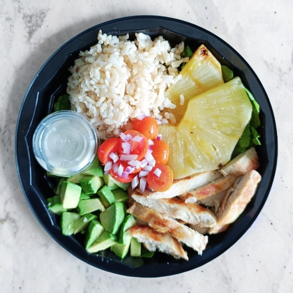 Pechuga de pollo a la plancha, mix de lechugas, arroz integral , piña asada, tomate cherry, cebolla morada, aguacate.