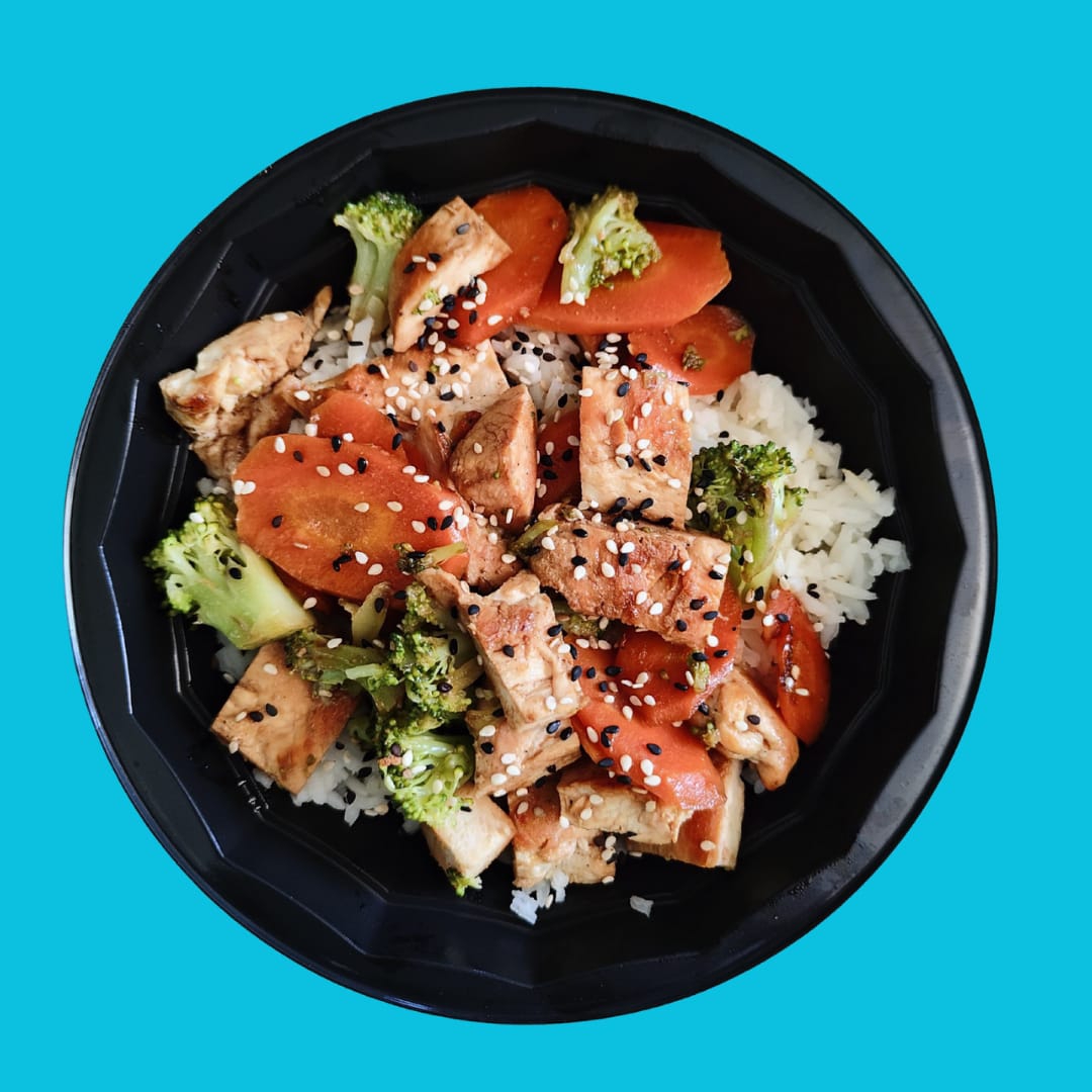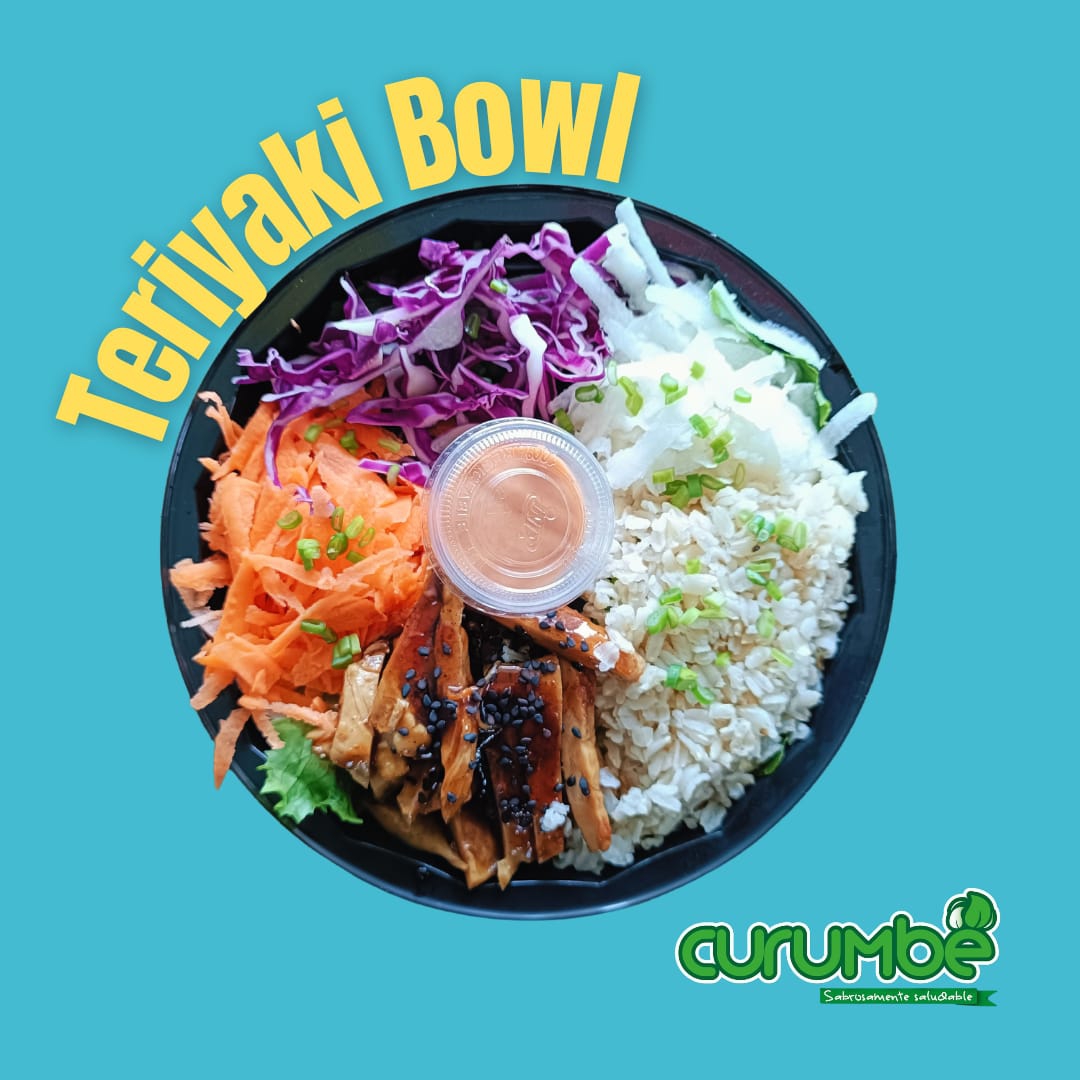 Pechuga de pollo a la plancha bañado en salsa teriyaki, mix de lechugas, arroz integral, zanahoria, col. morada, raíz de soya, cebollín y ajonjolí negro.