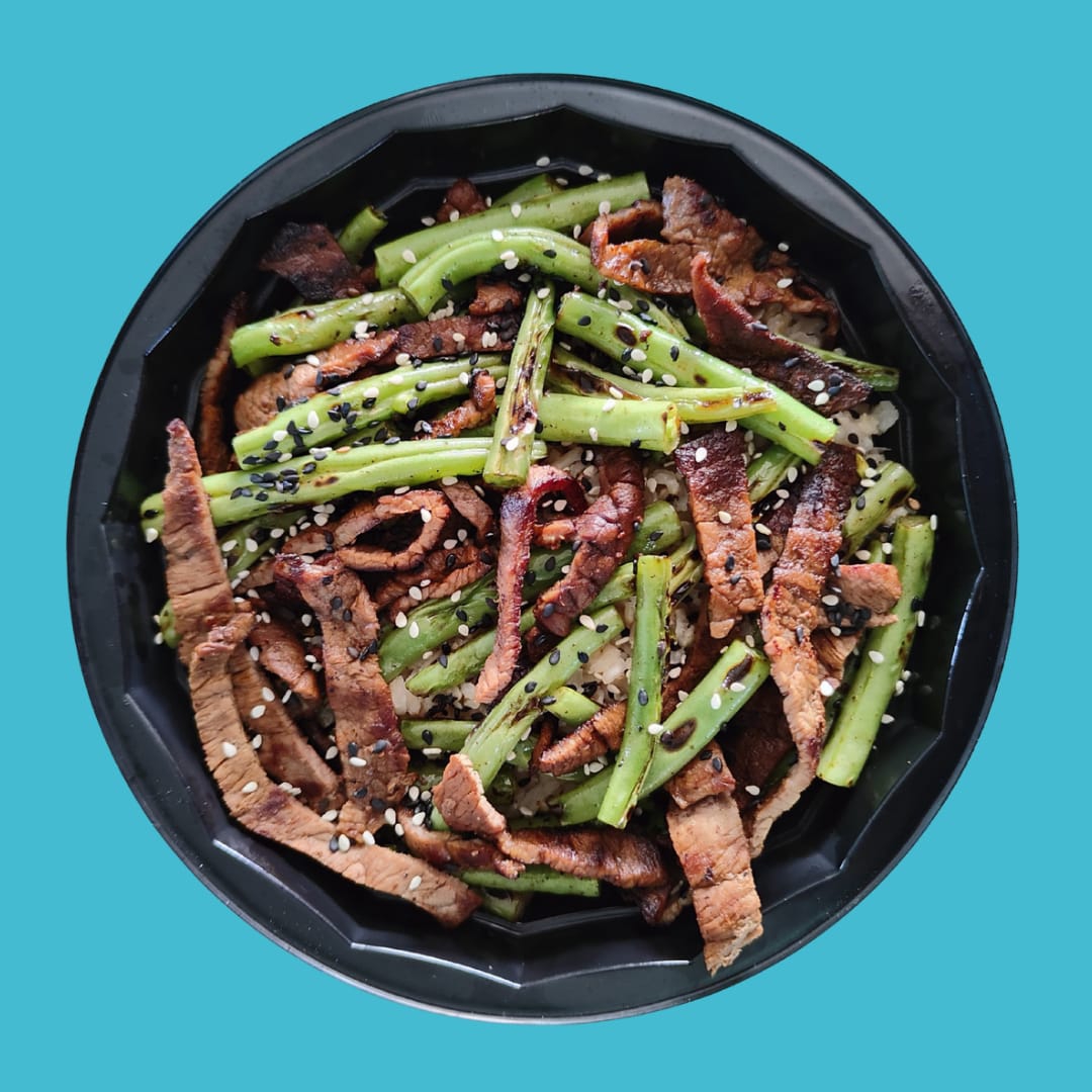 Salteado de res con ejotes y arroz integral. 150 gr proteina , 150 gr carbohidrato , 1 tz vegetales