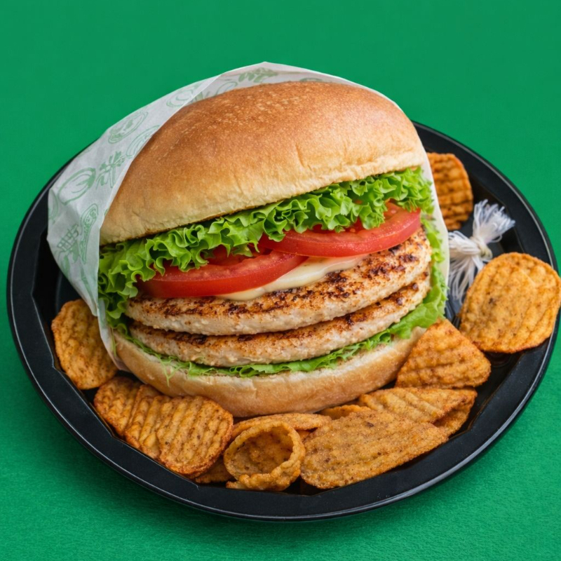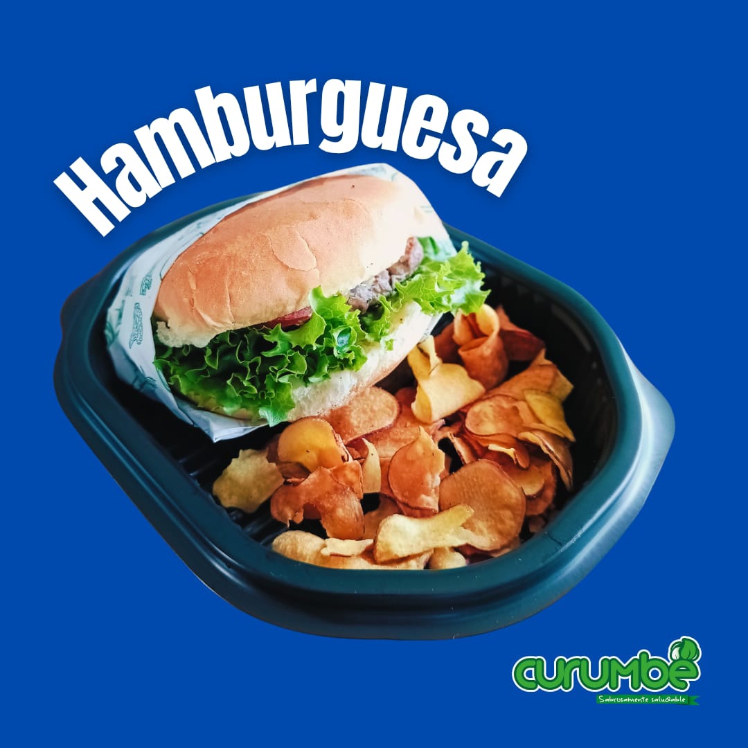 Pan blanco , 150 g de res (pulpa negra), queso manchego, mayonesa y vegetales. Acompañada de chips horneadas de verduras.