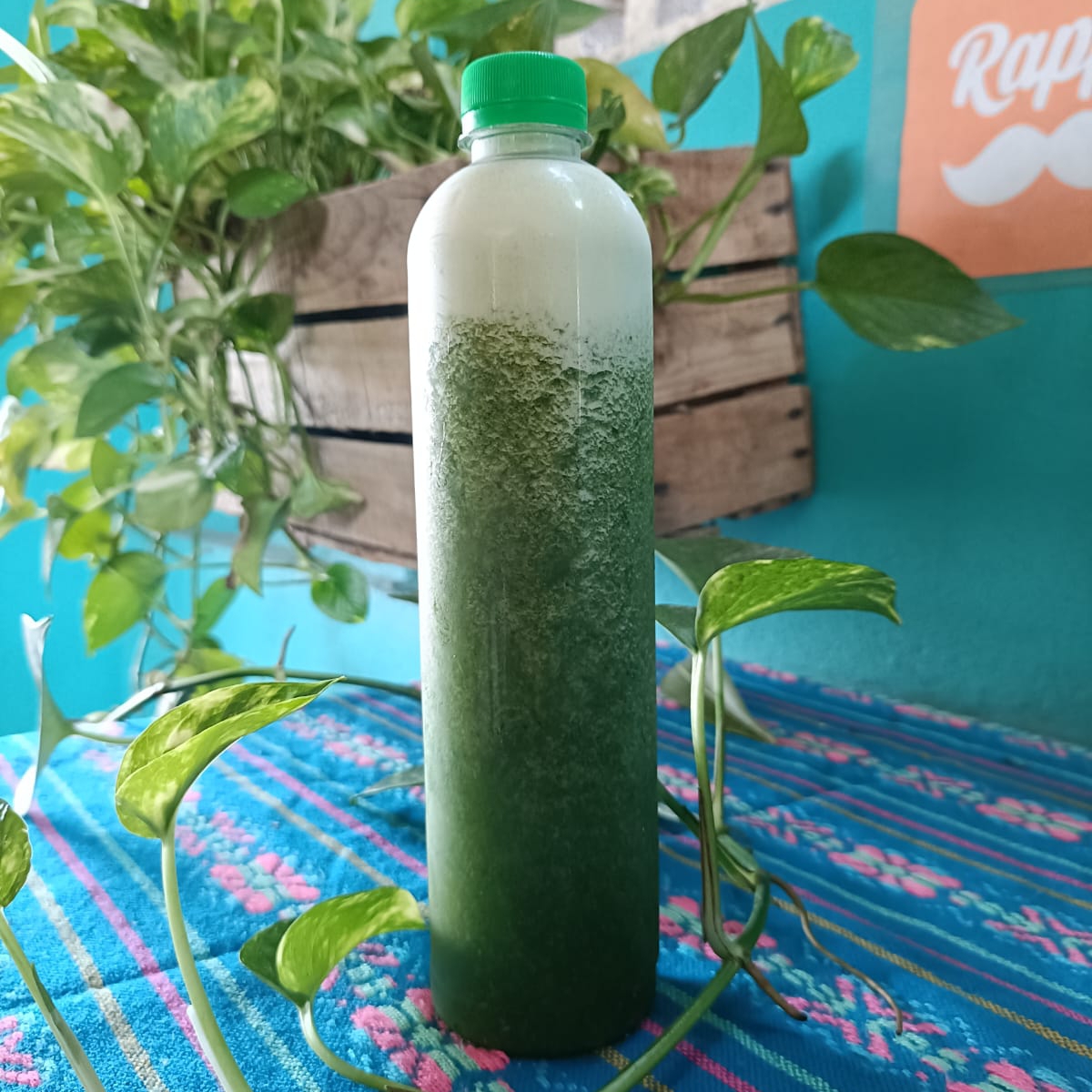 Medio litro, 100% Natural, jugo de naranja, nopal, apio, piña, espinaca y chía.