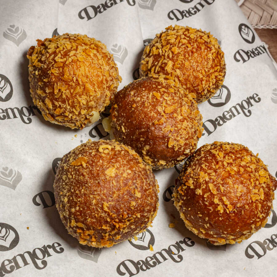 5 bolitas de masa empanizadas con panko rellenas de salchicha con queso manchego.