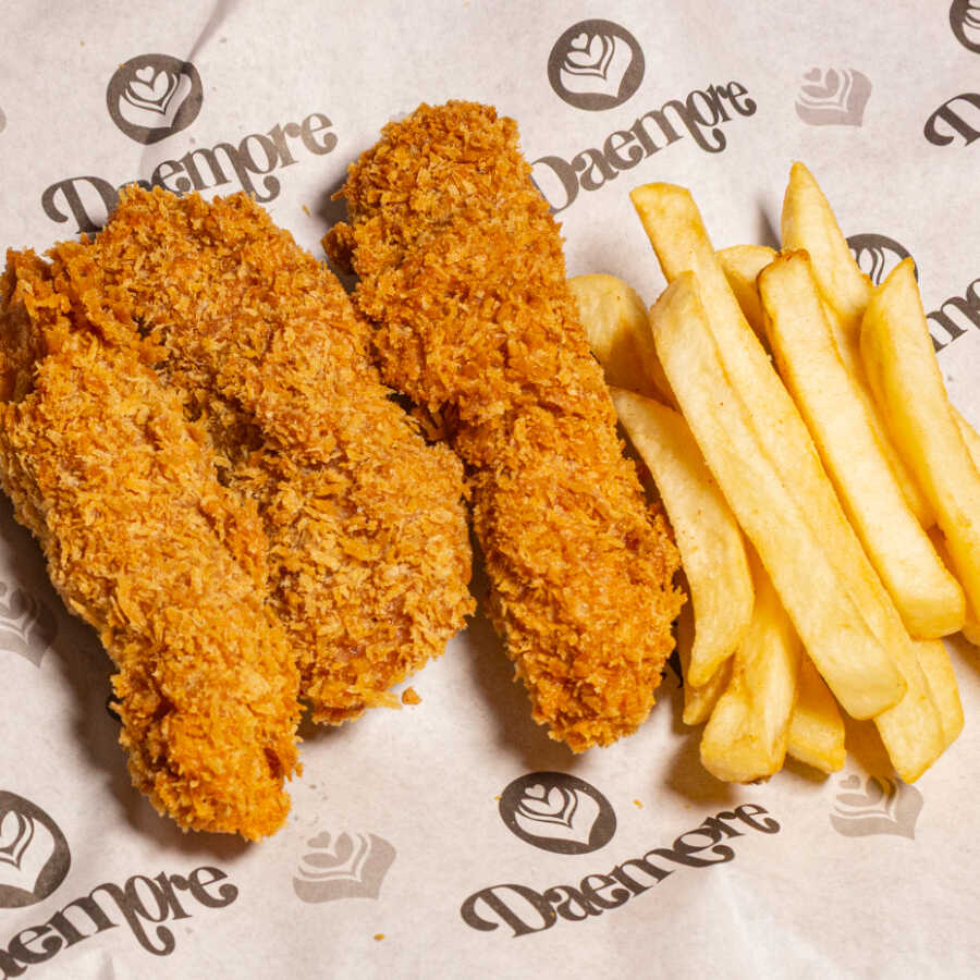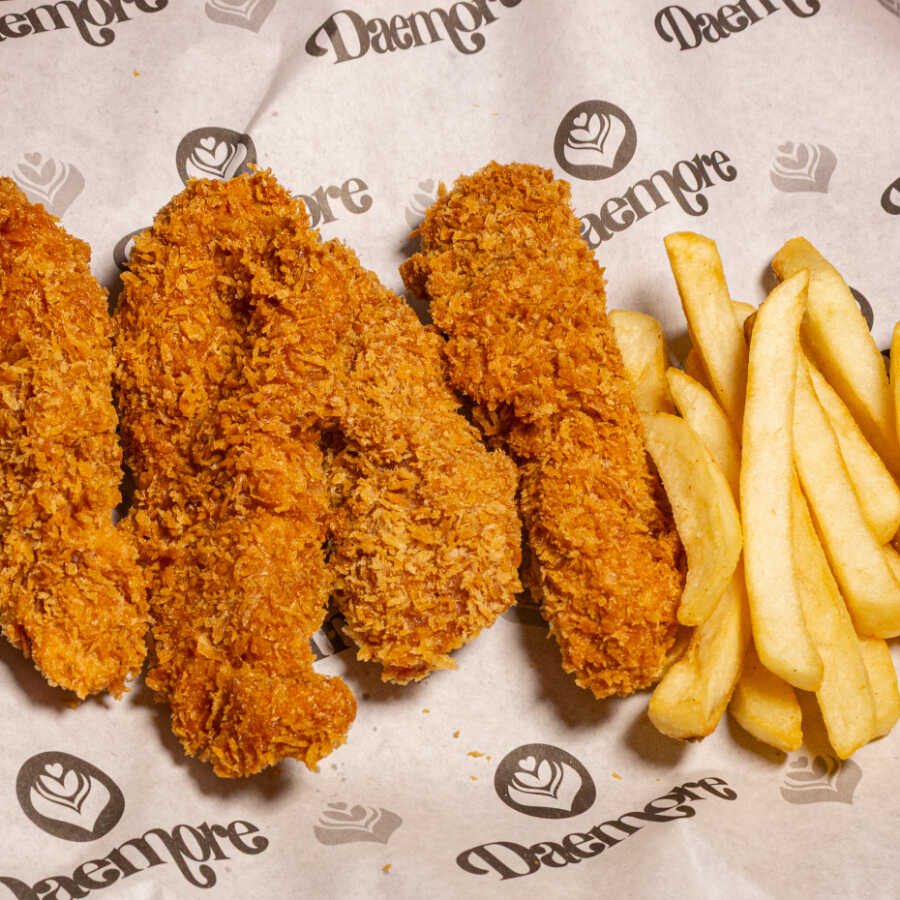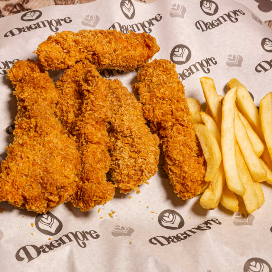 Deliciosas tiras de pollo marinadas y cubiertas con nuestro famoso empanizado japonés para lograr el Crunchy perfecto acompañado con papas a la francesa y aderezo ranch.