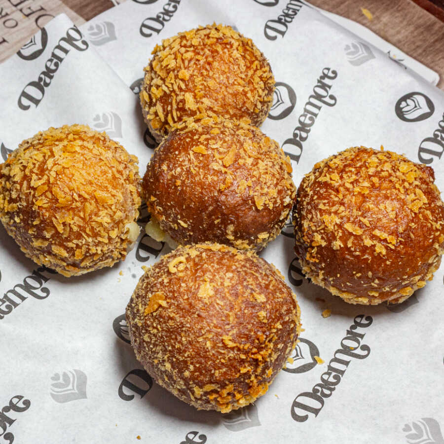 5 bolitas de masa empanizadas con panko rellenas de salchicha.