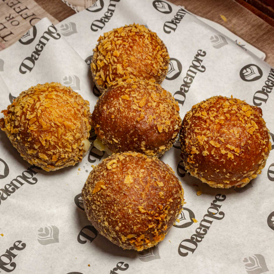 5 bolitas de masa empanizadas con panko rellenas de queso manchego.