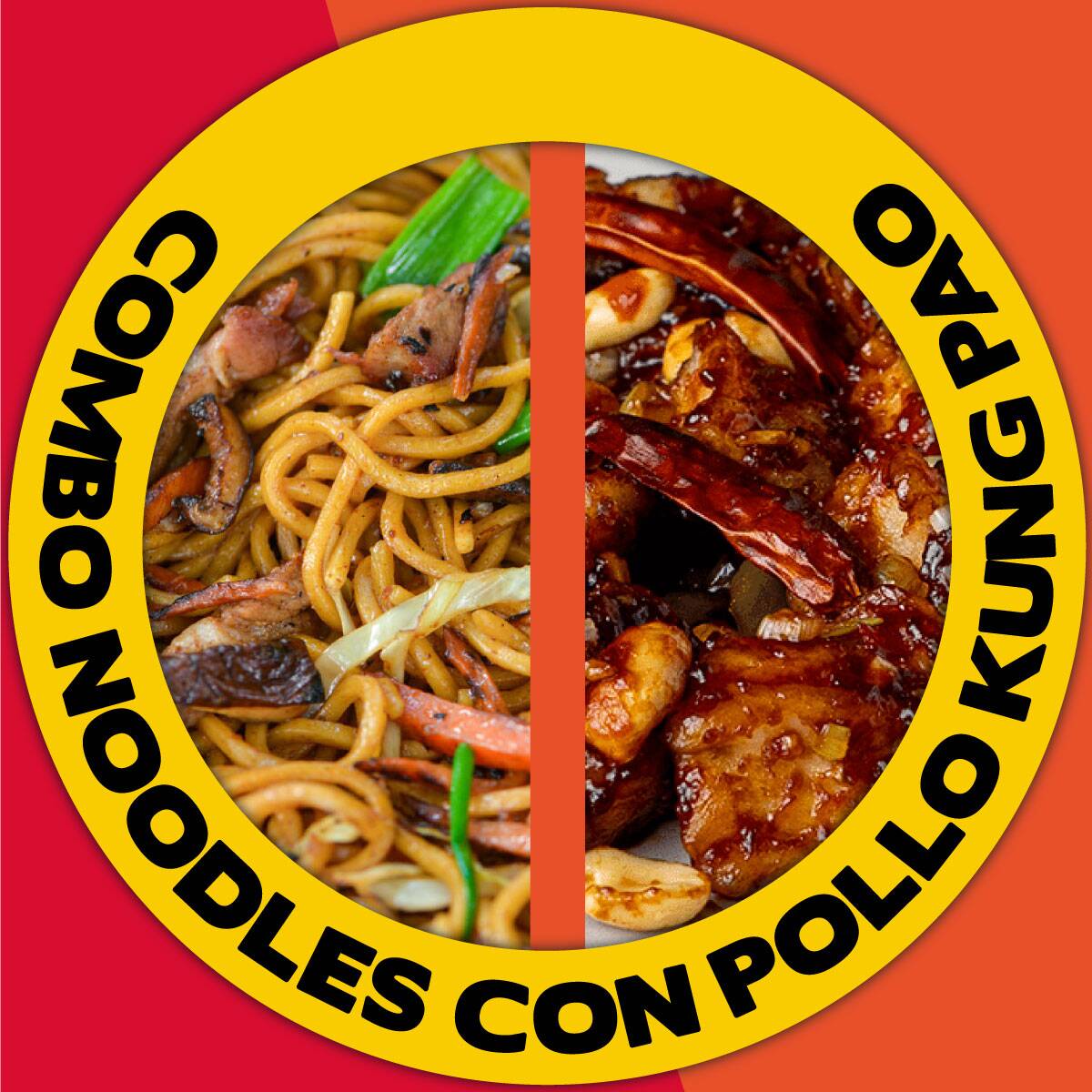 Deliciosa porción de 3/4 de litro de noodles cocinados y sazonados con salsas aromáticas, verduras crocantes, ñam, con un topping de nuestro codiciado pollo estilo kung pao, más picante que agridulce, en una combinación de salsas y licores que te volverán fanático desde el primer bocado.