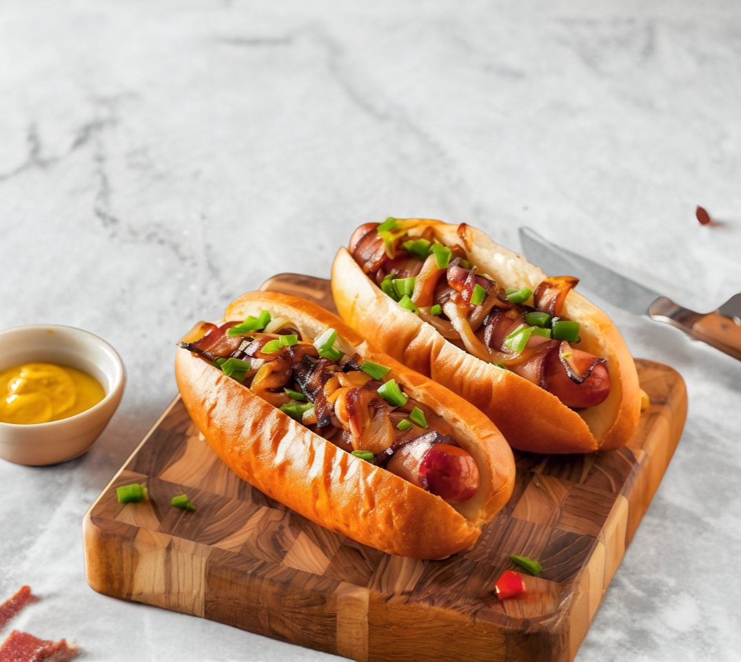 Salchihca jumbo gratinada con mozzarella, jamón, tomate, cebolla, jalapeños y papas fritas.