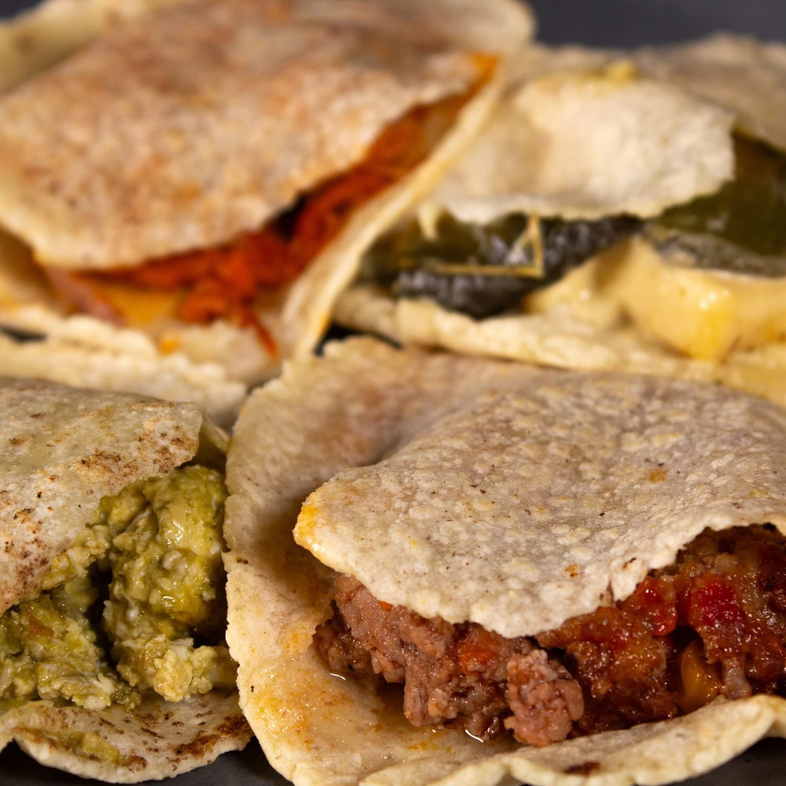 Cuatro tacos en tortilla recién hecha con costra de queso manchego acompañado de papas fritas y guacamole.