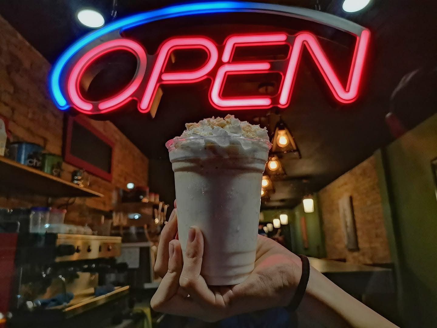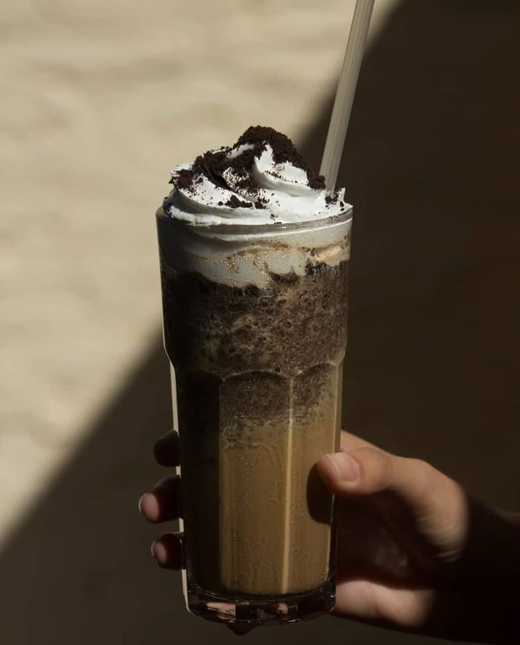 Nutella al fondo con hielos y leche de su preferencia, coronado con un batido de café con azúcar.
