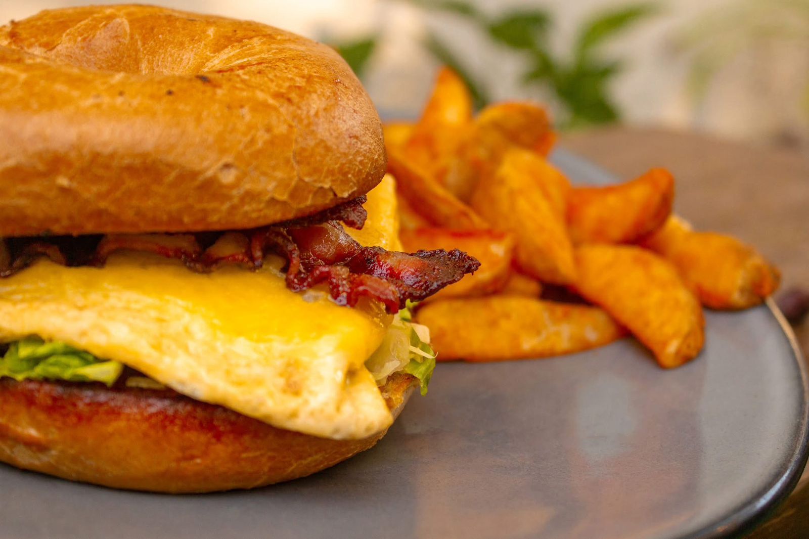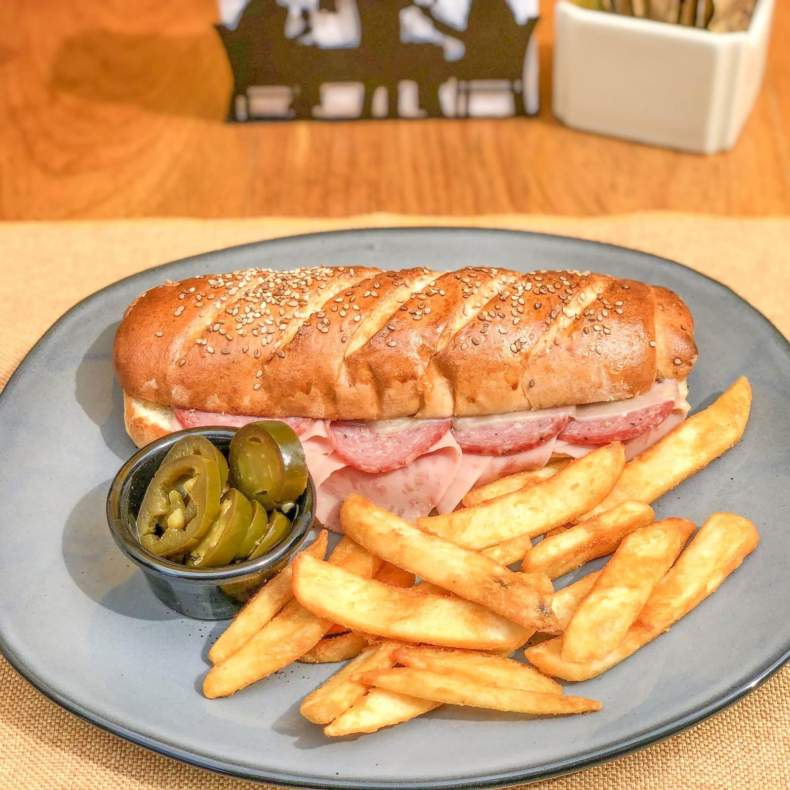 Montada en pan bimbollo acompañado con 90gr de carne, queso amarillo acompañado con papas fritas.