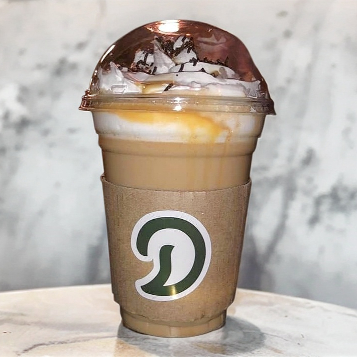 2 oz De café, caramelo líquido, crema batida, leche de su preferencia con hielo frapeado.