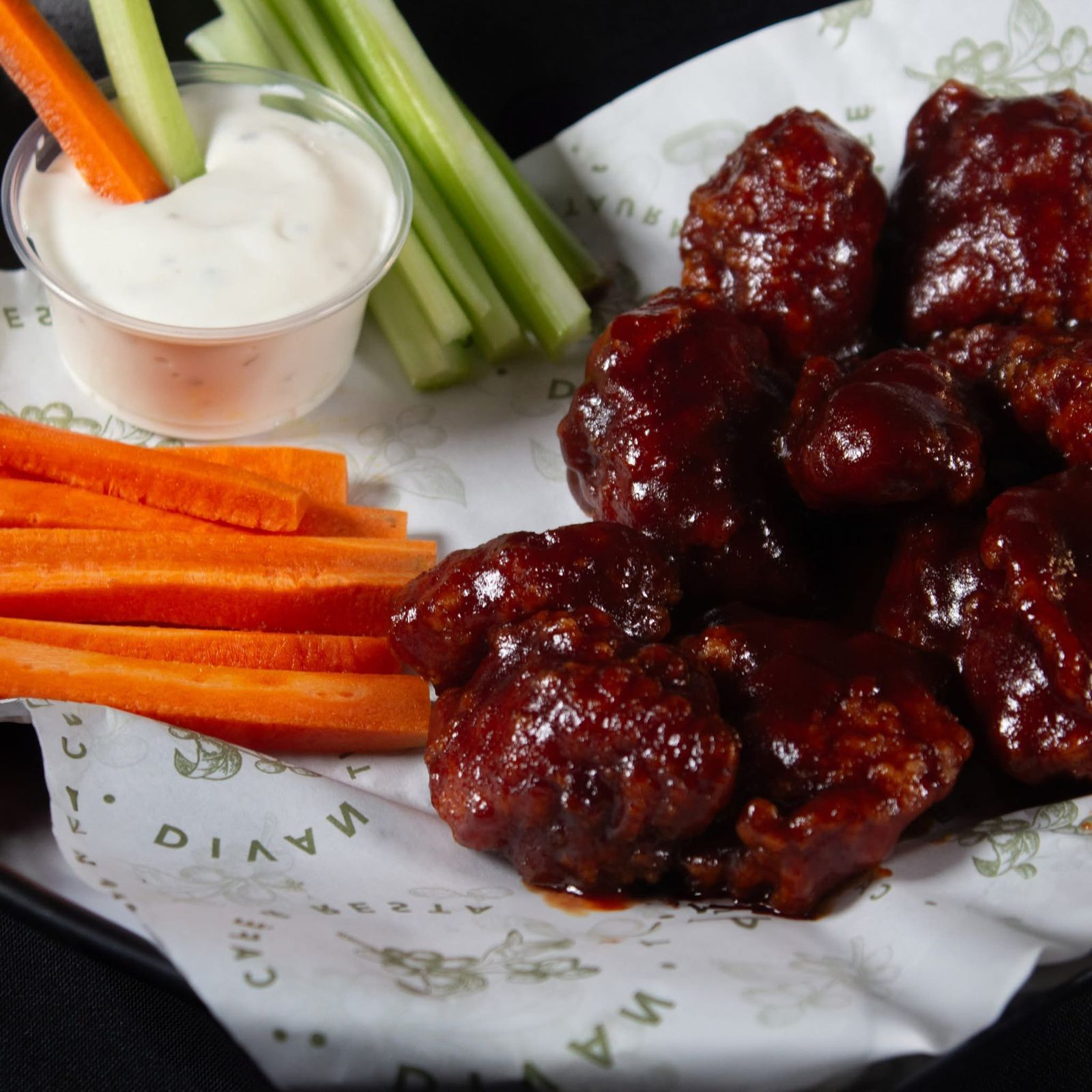 Ocho piezas de pechuga de pollo crujiente acompañada con apio y zanahoria en la salsa de tu elección: Búffalo, BBQ, Mango Habanero, Búffalo Ranch.