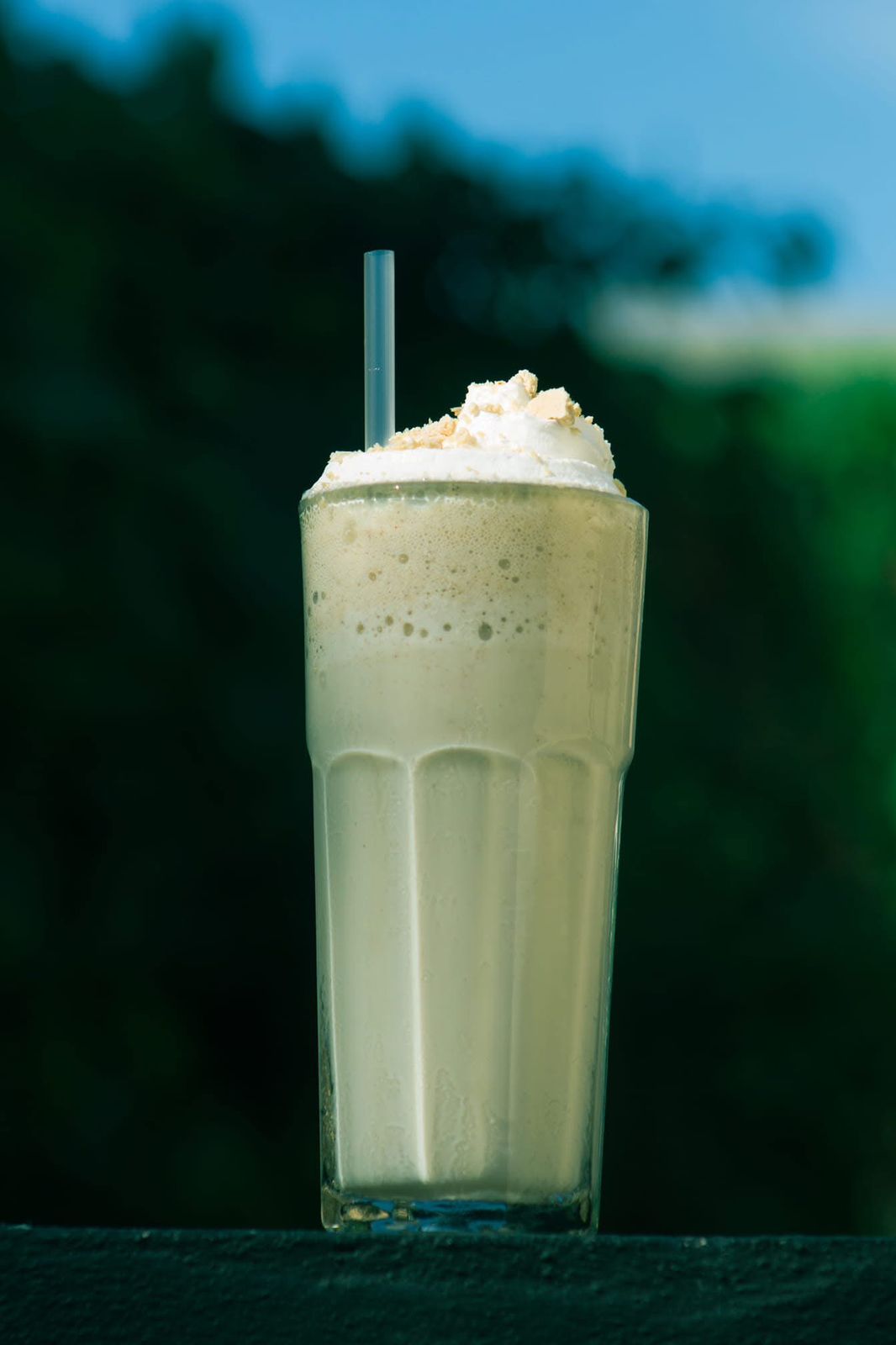2 cucharadas de café instantáneo batidas con 2 cucharadas de miel, 30 ml de agua, hielo y leche.