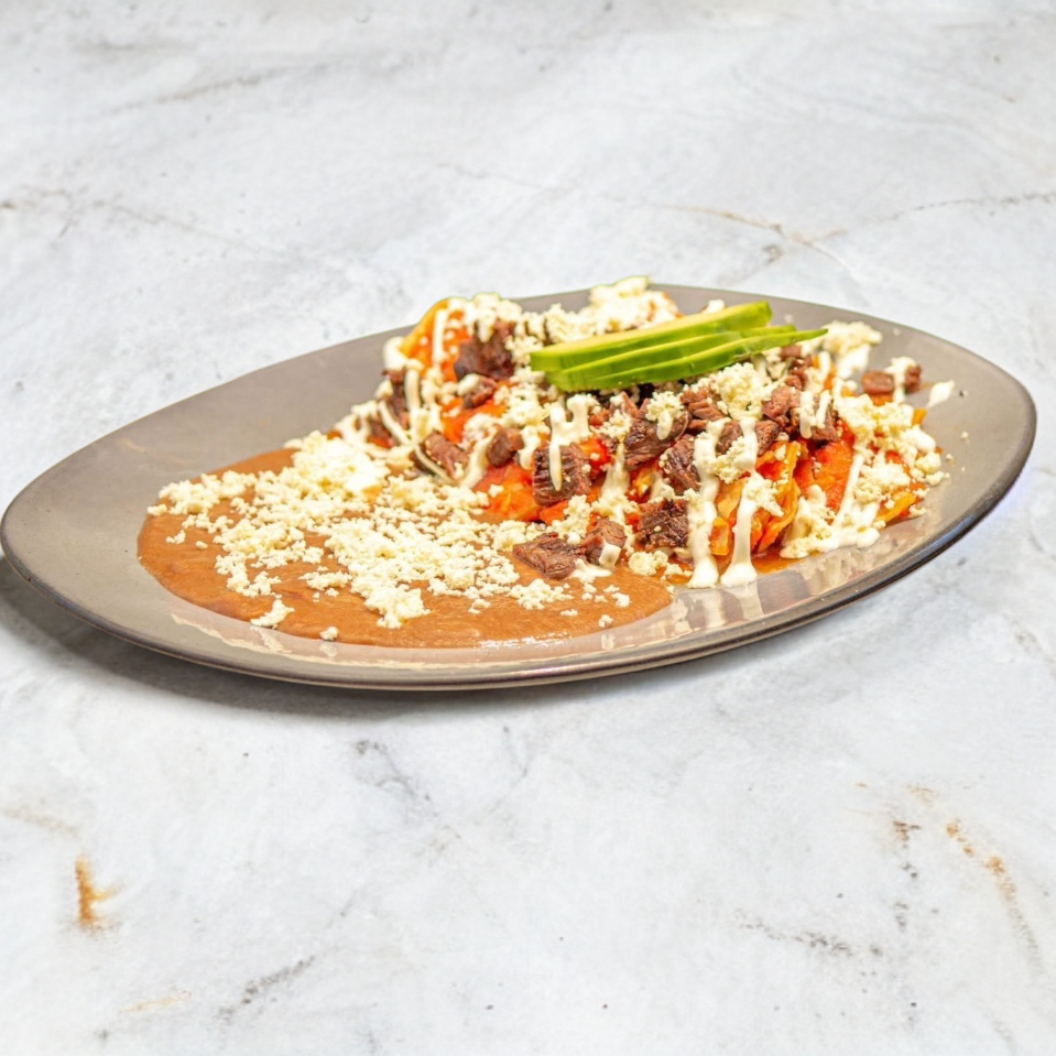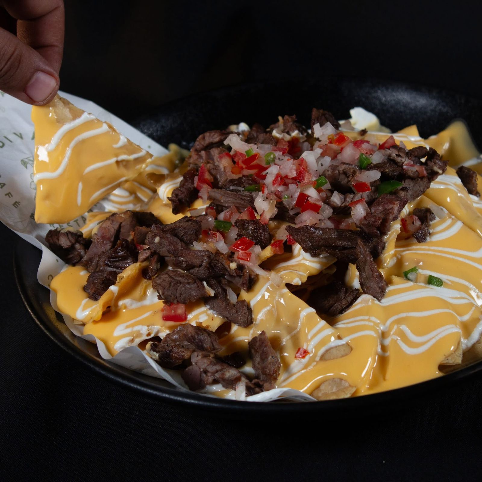 120 g de carne de arrachera a la plancha, 250 g de totopo bañado en queso cheddar acompañado con crema y pico de gallo.