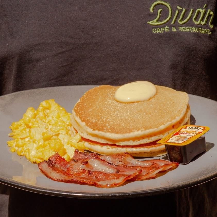2 Hot cakes, 2 huevos, tocino, café o jugo.