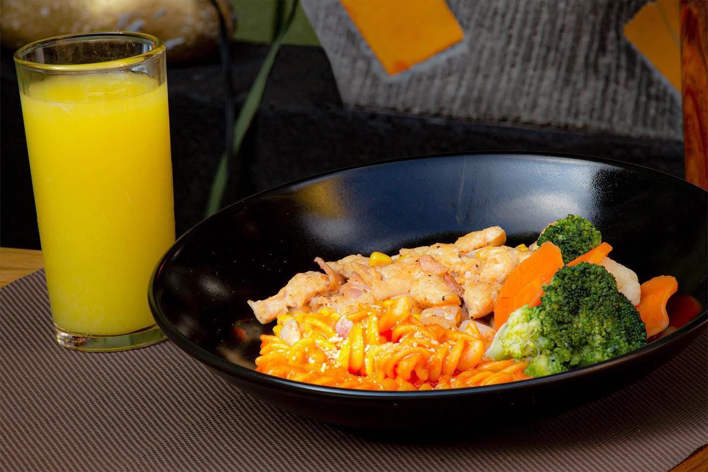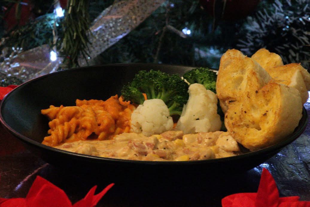 Crema al chipotle con tocino y elote, con verduras a la mantequilla y pasta.