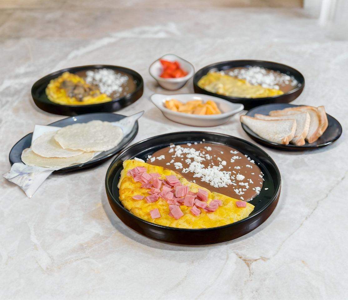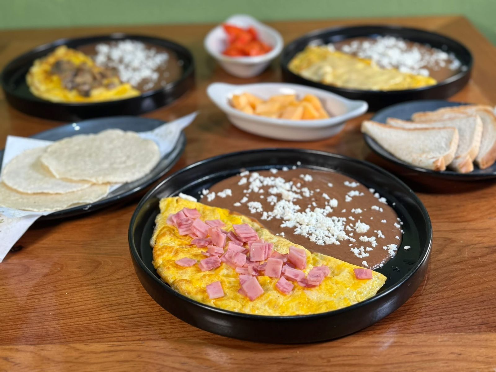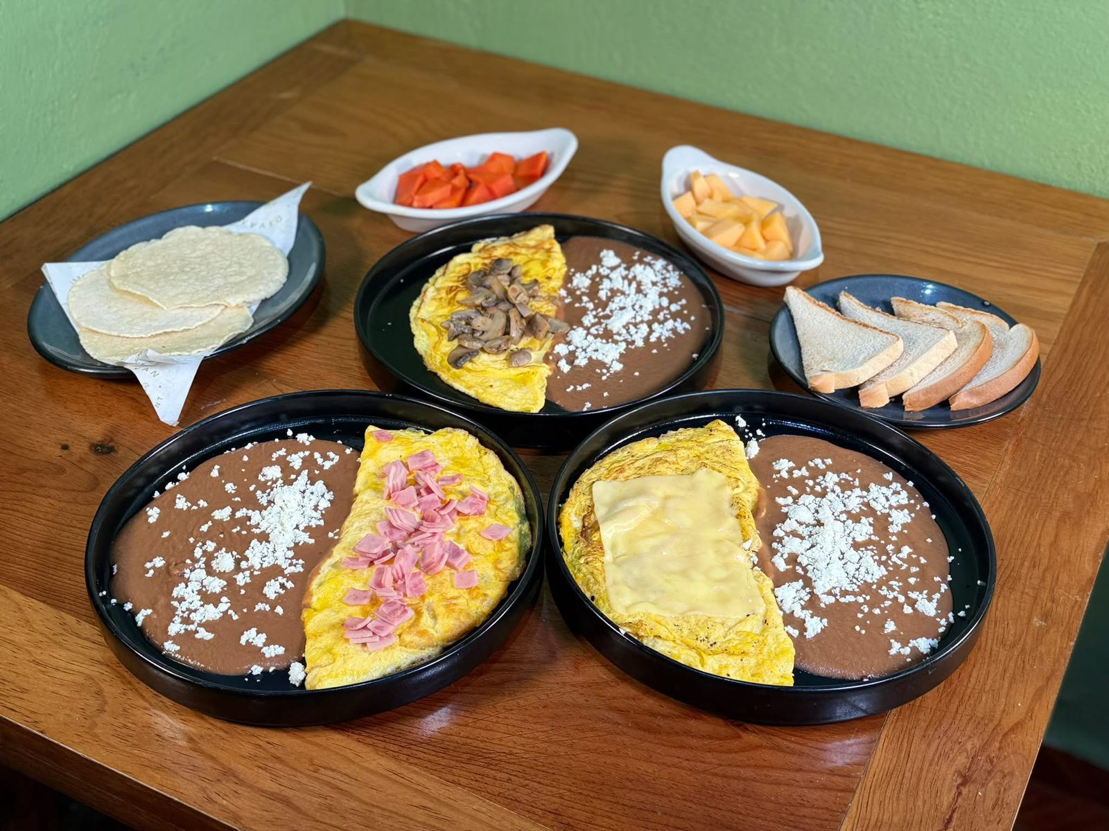 3 Piezas de huevo, 20 gramos de jamón con pimiento verde salteado, acompañado de queso manchego, frijol y queso fresco.