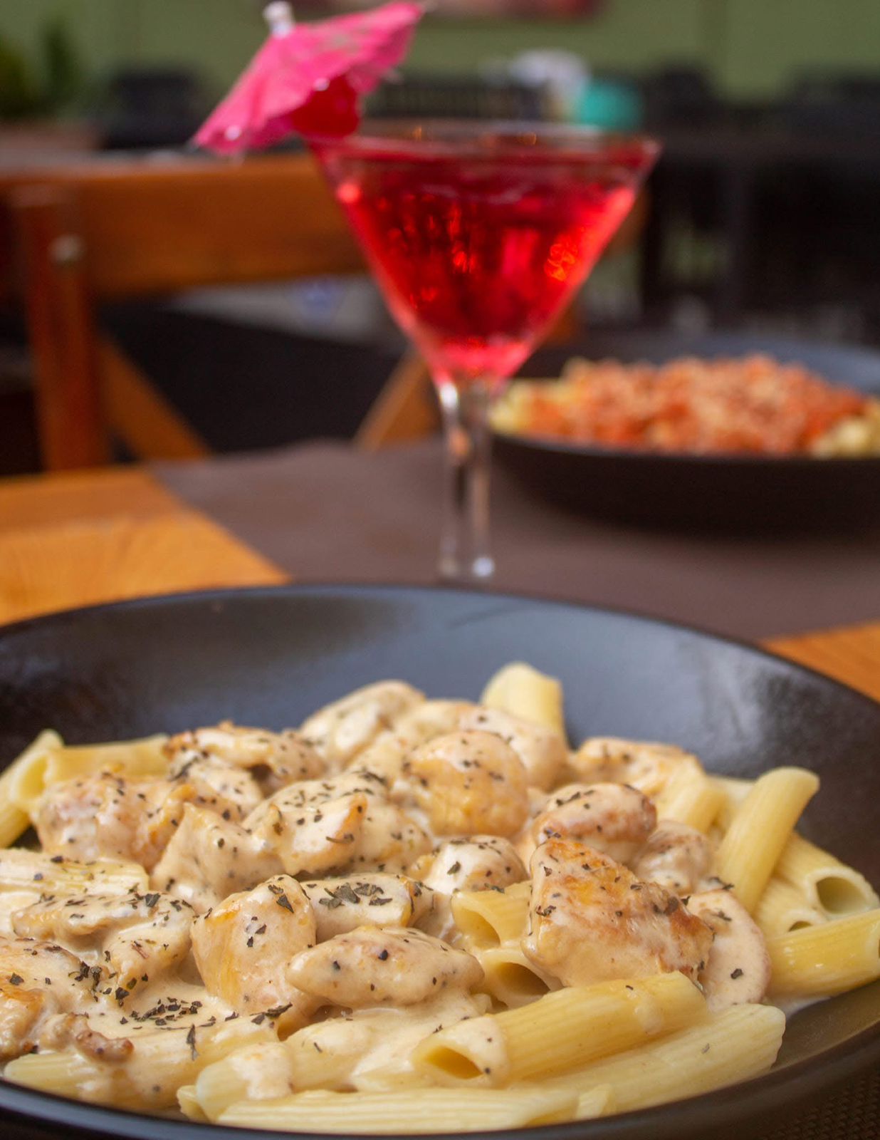 Pasta de temporada (160 g) en suave salsa blanca, acompañada de pollo y tocino. Un plato reconfortante y lleno de sabor.