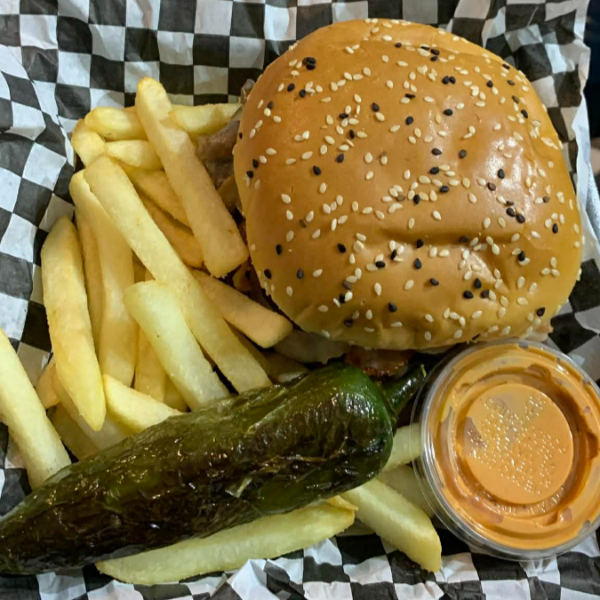 Carne de res, pan parrillero, mayonesa, catsup, ensalada, tomate, cebolla, queso y tocino. Acompañada con papas fritas, chile toreado o chiles jalapeño.
