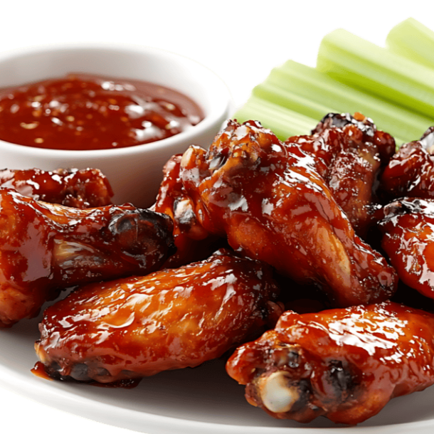 8 Alitas, salsa a elegir acompañado con zanahoria, aderezo ranch y papas fritas.