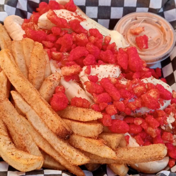 Salchicha Jumbo de pavo, pan horneado, mayonesa, catsup, ensalada, tomate, cebolla, cheetos flaming hot y papas fritas...Chiles toreados o Jalapeños.