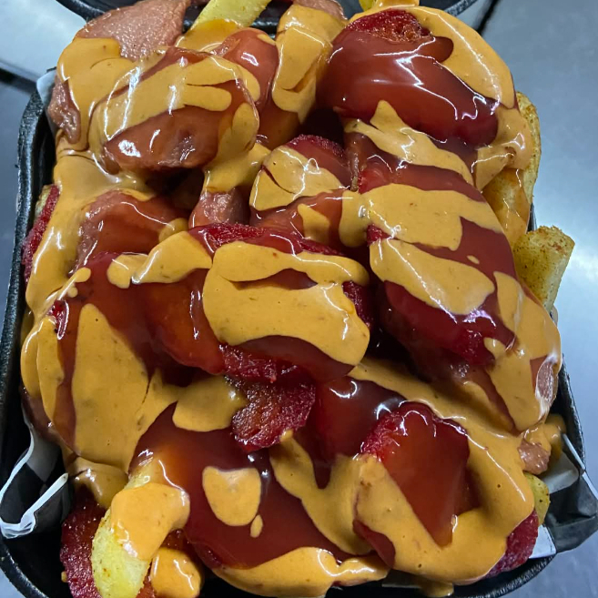Salchicha de Pavo, Salchicha para Asar, Papas Fritas Bañadas en Catsup y Aderezo Chipotle.
