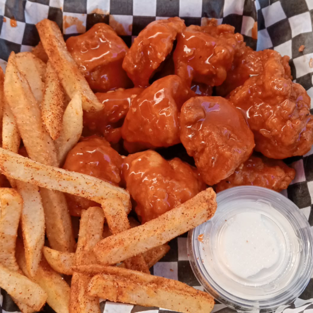 12 Boneless salsa a elegir acompañado con zanahoria,aderezo ranch y papas fritas.