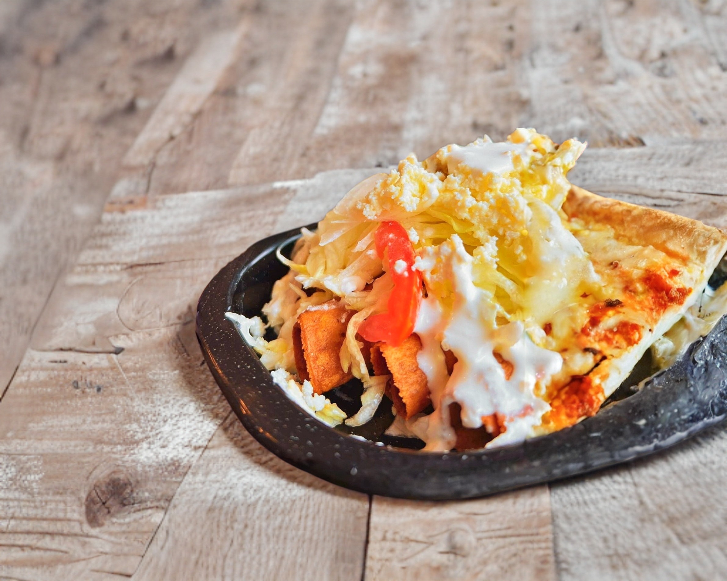 Masa mezclada con queso manchego, base de guacamole. arrachera, tiras de nopal, queso y crema