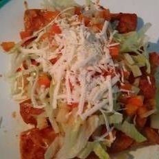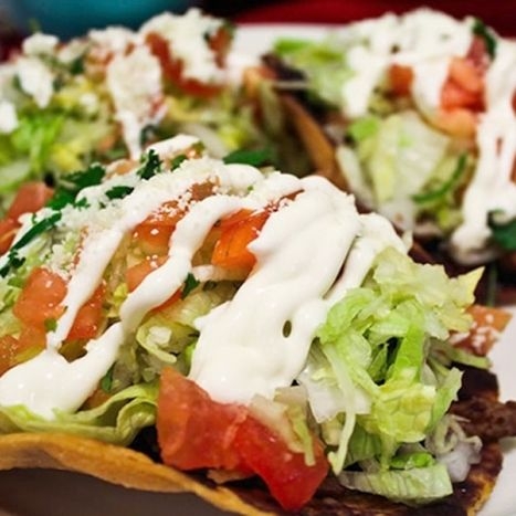 Tortilla roja dorada, frijol carne verdura, queso, aguacate, crema, papas fritas
