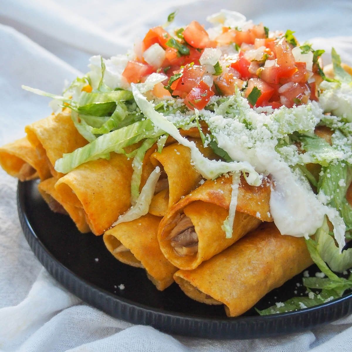 Tacos fritos de tortilla grande con carne y verdura