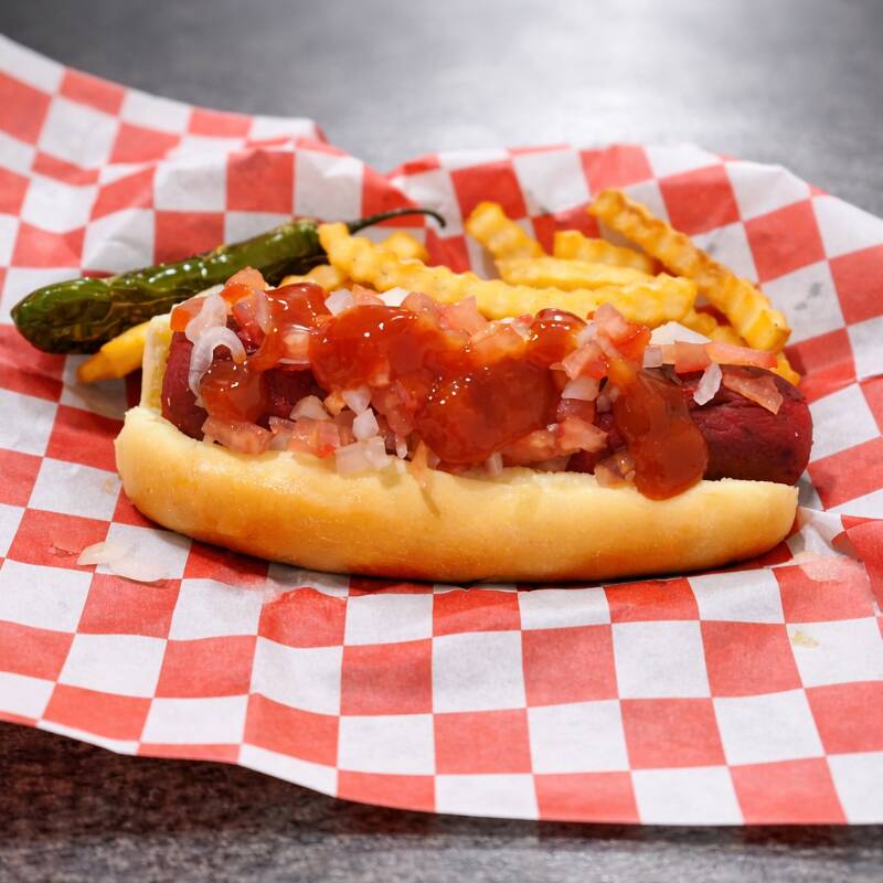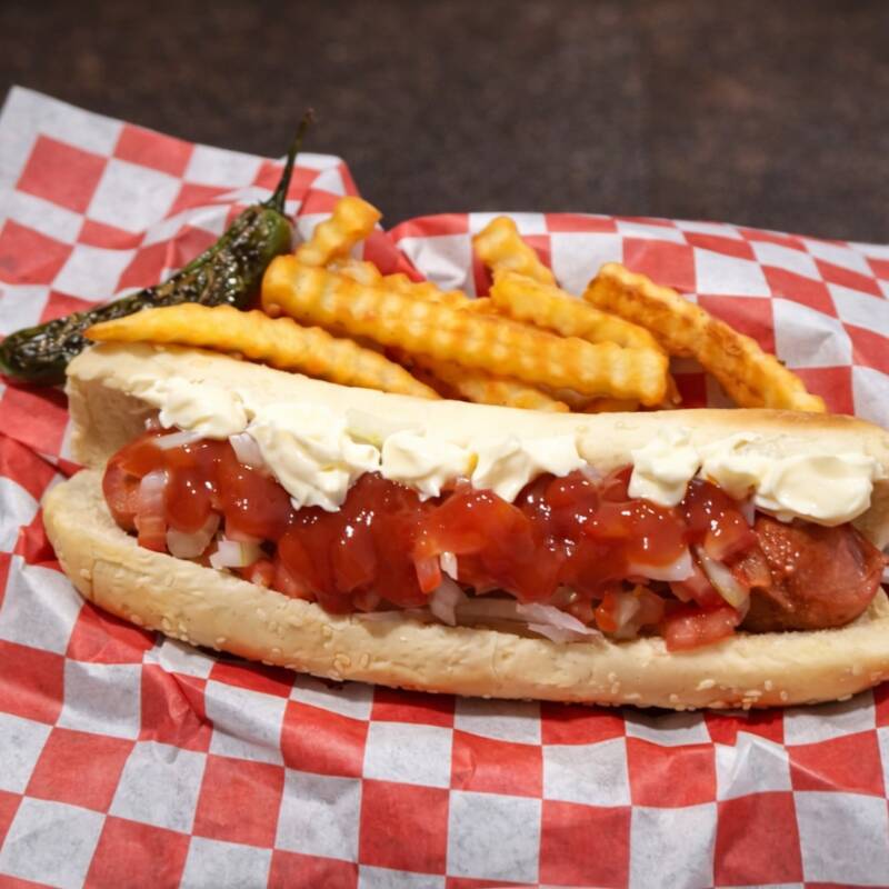 Salchicha ROJA, pan suave y aderezos clásicos, listo para un viaje rápido por el castillo.