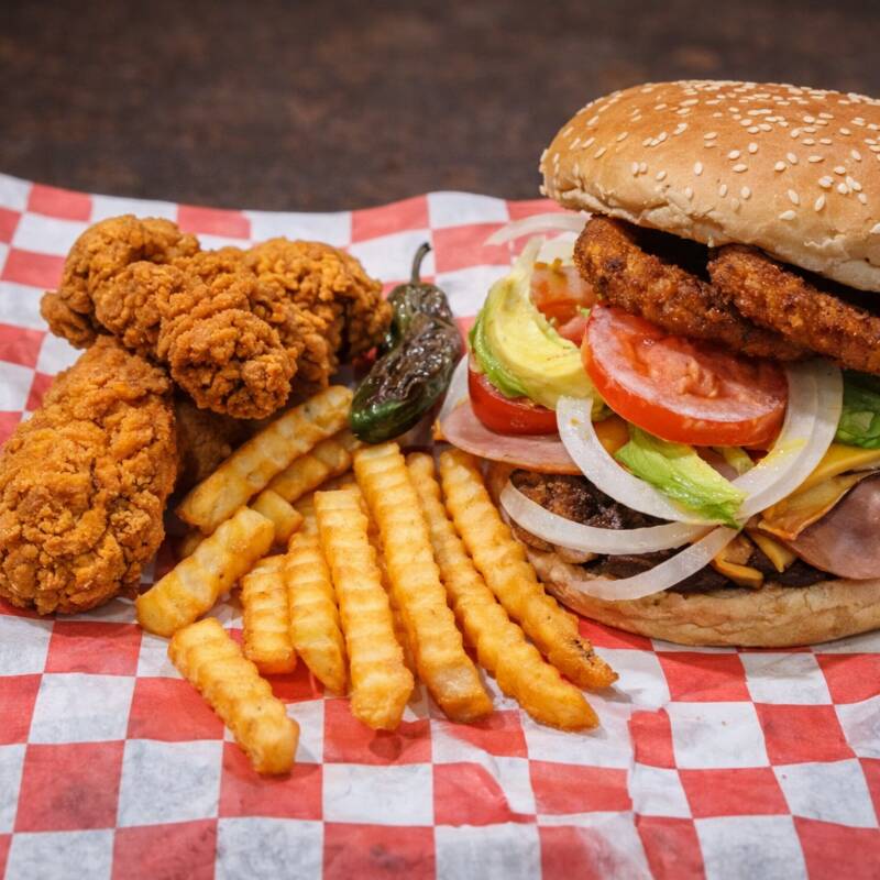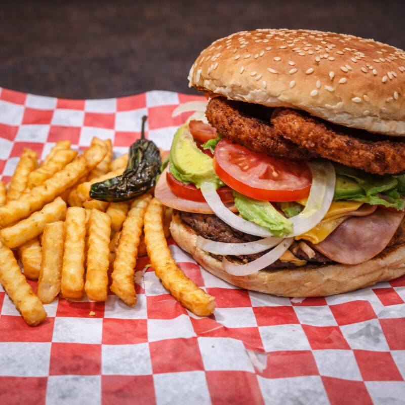Jugosa hamburguesa coronada con boneless crujientes bañados en salsa mágica, para los magos más valientes.