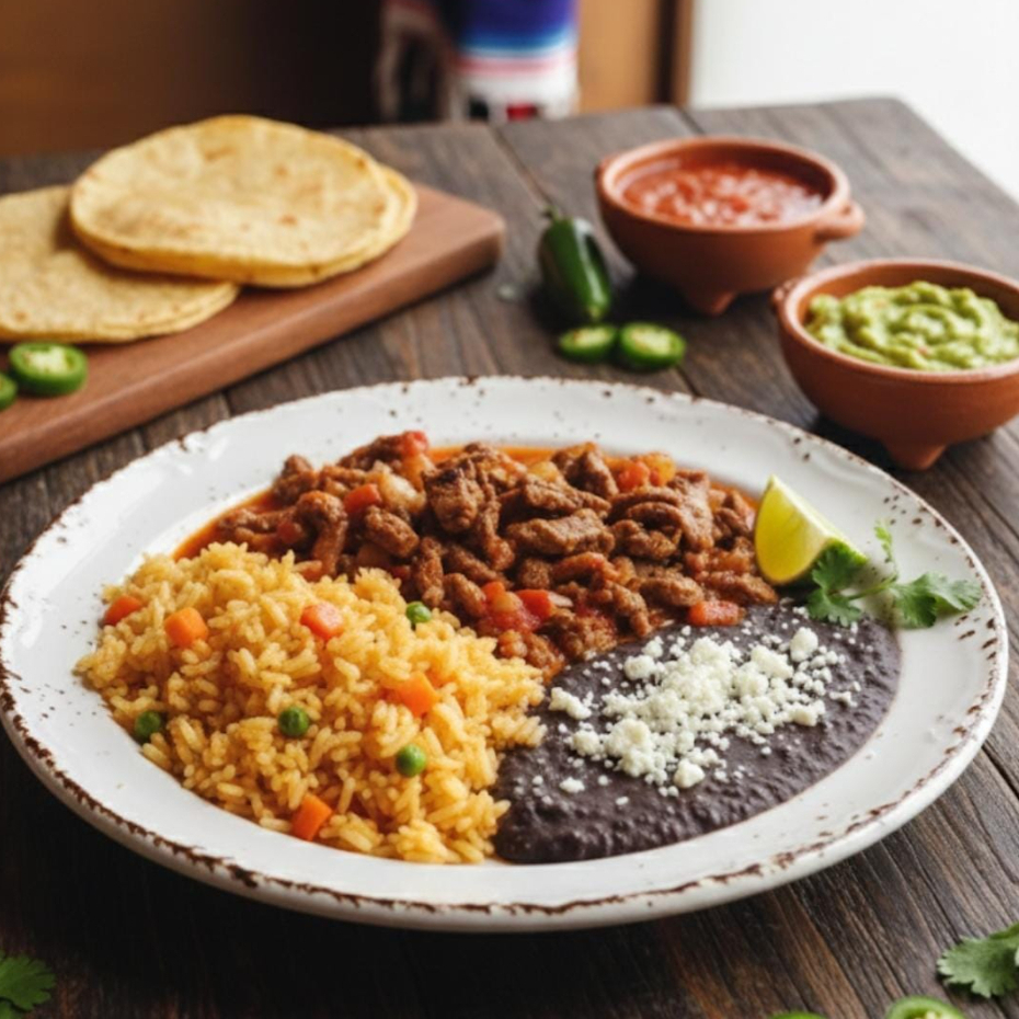 Bistec a la mexicana preparado con jitomate, cebolla y chile, lleno de sabor casero 🥩🌶️🍅. Acompañado de arroz rojo y frijoles refritos para un platillo completo y tradicional. ✨