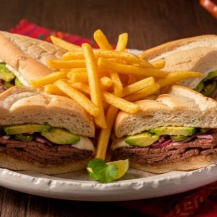 Torta rellena de carne de res con guacamole, frijoles y chile chipotle, servida en pan suave y acompañada de papas fritas 🥑🌶️🥪. Un antojo abundante y lleno de sabor casero. 🍟✨