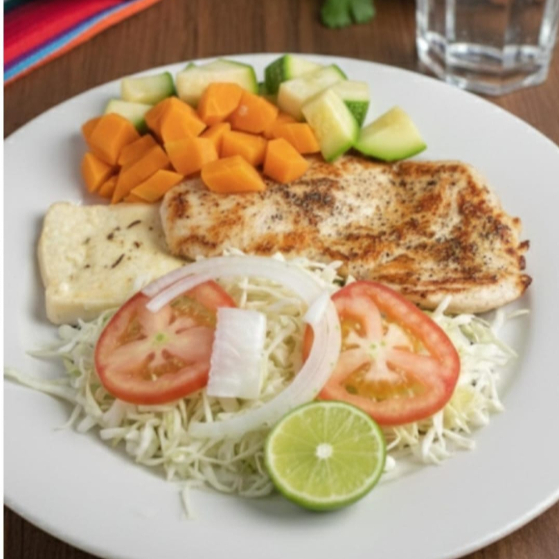 Pechuga de pollo asada, jugosa y preparada al momento, acompañada de verduras al vapor y ensalada de lechuga 🐔🥦🥗. Un platillo ligero, saludable y lleno de sabor casero. ✨