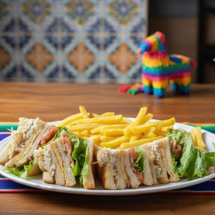 Club sandwich preparado con jamón, queso amarillo, pollo desmenuzado , tocino crujiente, lechuga fresca y tomate 🥪🥓🍗. Acompañado de papas doradas, es un platillo completo y lleno de sabor. 🍟✨